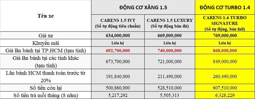 KIA Carens (All New) | 1.5G AT IVT | 634 triệu (giá niêm yết) |